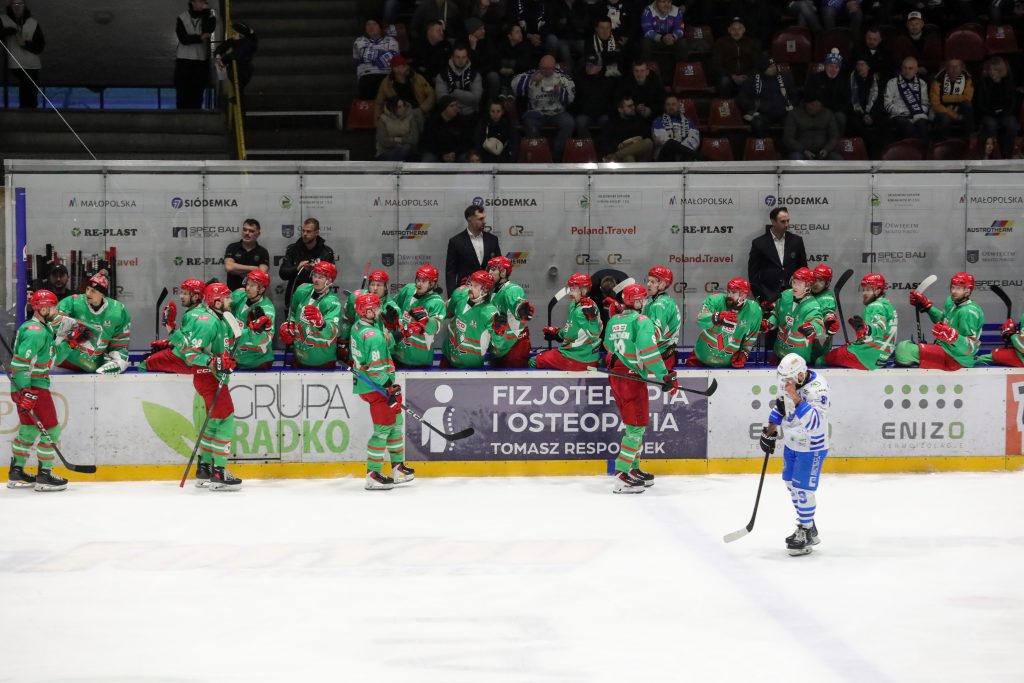 Podopieczni Roberta Kalabera wiedzieli, że muszą ruszyć, by jeszcze w tym starciu powalczyć. Gospodarze szybko znaleźli odpowiedź na poprzedni bramki Zagłębia. Już w 27. sekundzie trzeciej odsłony Peresunko świetnie wypatrzył Moutreya, a drugi z wymienionych ze spokojem ulokował gumę przy dalszym słupku bramki Halonena. Unici złapali kontakt i wiatr w żagle, ale świetnie spisywał się w bramce przyjezdnych Niilo Halonen, który bronił kolejne próby oświęcimian. Sosnowiczanie mieli kilka świetnych okazji w dalszej części trzeciej odsłony, ale ich nie wykorzystali. Oświęcimianie wykorzystali tą nieskuteczność gości i na nieco ponad 3 minuty przed końcem do wyrównania doprowadził Ołeksandr Peresunko, który wykorzystał błąd sosnowiczan i nie pomylił się w sytuacji sam na sam. Gdy wydawało się, że wszystko zmierza do dogrywki po wyrównaniu Unii, to błyskawicznie odpowiedzieli goście z Sosnowca. Zza bramki obsłużony został Jere Jokinen, który mając trochę miejsca i czasu znalazł lukę przy lewym słupku bramki Lundina i po raz kolejny wyprowadził podopiecznych trenera Lehtonena na prowadzenie. Przyjezdni tego prowadzenia już nie oddali i uporządkowali końcówkę spotkania pod swoje dyktando, czym znacznie zwiększyli swoje szanse w rywalizacji o brązowe medale.
